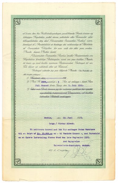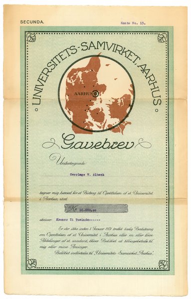 Månedens billede viser for- og bagside af førende universitetsforkæmper i Århus, overlæge, dr.med. Victor Albecks genpart af gavebrev til denne indsamling anno 1921.