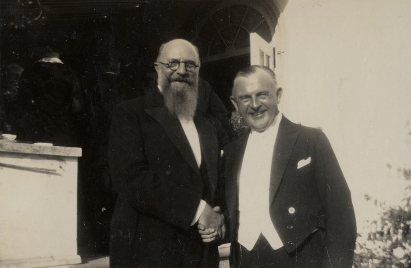 Månedens billede viser landsretssagfører Carl Holst-Knudsen sammen med statsminister Thorvald Stauning, og datoen er 11. september 1933. Det var dagen, hvor Aarhus Universitet blev indviet, og honoratiores var i den anledning inviteret til frokost i Holst-Knudsens hjem på Strandvejen i Aarhus. Optagelsen stammer fra dette frokostbesøg.