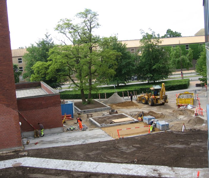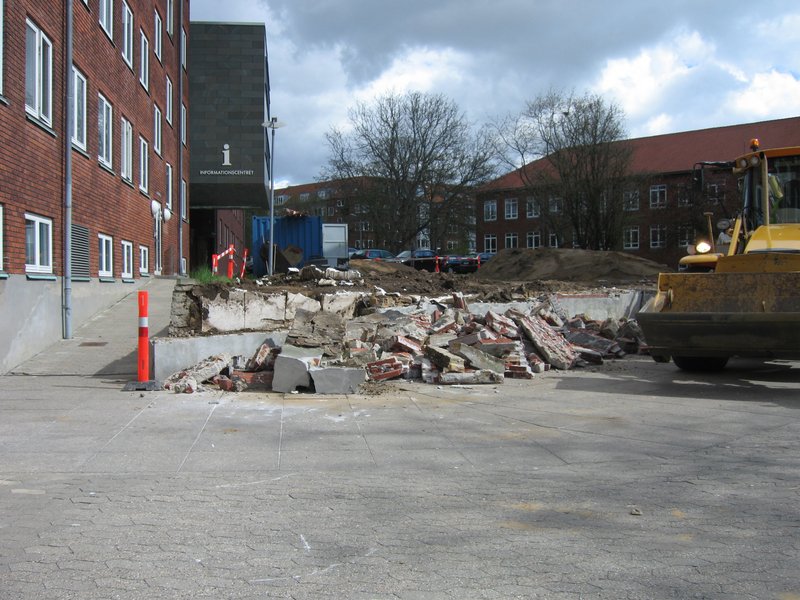"Berlinmuren" blev den kaldt, for selv om man altså sagtens kunne komme uden om den ad stien langs bygning 1445, fandt universitetet med tiden, at den sendte et uheldigt signal om, at besøgende studerende i Informationscentret kun var moderat velkomne, og den blev derfor fjernet i sommeren 2010 og erstattet at et mere imødekommende miljø.