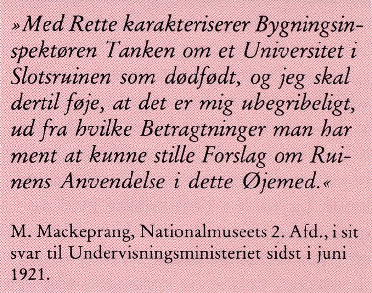 I 1921 fremkom et forslag om at lade Kolding Slotsruin danne ramme om et kommende jysk universitet. Om dette og andre forslag kan man læse i Siden Saxo, nr. 2, 1989. På gentagne opfordringer har vi fremstillet en betydelig bedre pdf-fil af artiklen end den, man hidtil har kunnet klikke frem.
