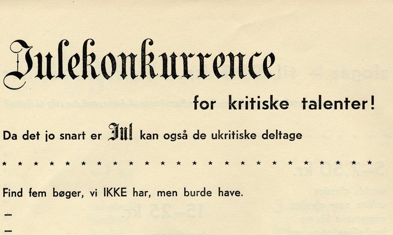 Som sædvanlig har Månedens billede i december noget med jul at gøre. I år er valget faldet på en 58 år gammel jule-annonce for Akademisk Boghandel, der indtil året forinden havde heddet Bogimporten, men som nu i 1954 også havde fået mulighed for at forhandle dansk litteratur.