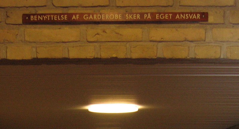 Dette skilt, som har siddet på sin plads ved Hovedbygningens kældergarderobe i 48 år, er forsvundet i løbet af efteråret 2012. Skiltet har været efterlyst blandt ansatte i driftsinspektørens område, men uden resultat, og konklusionen må derfor blive, at skiltet er stjålet.