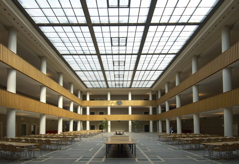Bygningen var forsynet med et massivt tårn med et spinkelt spir og rummede en enorm ”Lichthof” (lysgård eller lyshal) – bygningens centrale rum - samt en stor aula foruden ca. 170 andre lokaler.