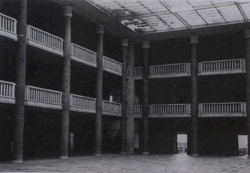 Som led i bestræbelserne på at ”mildne bygningens fremmede præg” tildækkede man således dele af lysgårdens – den nuværende aulas - gennemgående søjler med brede bånd af lyse egetræspaneler, der samtidig skjulte det oprindelige stenrækværk, og desuden huggede man kapitælerne af søjlerne.