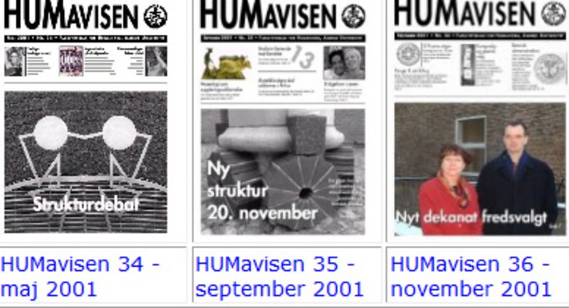 På baggrund af et aktualitetskriterium har Arts besluttet at fjerne links til den hedengangne HUMavisen fra sin nyhedsside og samtidig overdraget publikationens elektroniske arkiv til AU Universitetshistorie. Herover ses overgangen til bladets brug af farveforsider i 2001.