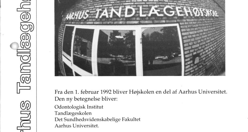 AU Universitetshistorie har erhvervet en samling af nyhedsbreve mv. fra Århus Tandlægehøjskole 1981-1991. En del omhandler nedlæggelsesplaner 1983/1984 og 1988 samt fusionsplaner. Ved klik på billedet herover ses, at fusionen med Aarhus Universitet var en realitet i 1992.