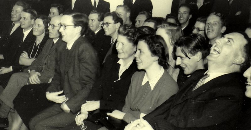 Som tidligere år har Månedens billede i december noget med jul at gøre. På billedet ser vi nemlig det feststemte publikum ved årets teologrevy ved teologernes julefest i december 1946. Det var Teologisk Forening, der stod for såvel julefesten som revyen. Foreningen, der var blevet oprettet i 1939, havde også i årene før 1946 holdt julefester med revy, men det nævnte år foregik begge dele for første gang på selve universitetet.