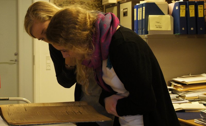 De to business communication-studerende Inge Katrine Riber Meldgaard og Anne-Sofie Vittrup Thorsted (forrest) har aflagt studiebesøg med henblik på besvarelse af en studieopgave om den aarhusianske studentersports organisationsforhold siden oprettelsen af Jydsk Akademisk Idrætsklub i 1930. Herover studeres sportsomtale i tidsskriftet Den jydske Akademiker fra 1930.