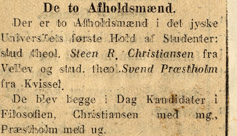 Et ganske interessant bidrag til det spæde aarhusianske universitets studenterstatistik er for ganske nylig 'dukket op', dvs. blevet opdaget, for det har såmænd befundet sig i vore gemmer i nogle år, nærmere bestemt i arkivsamlingen vedr. den ene af de to nævnte studenterafholdsmænd, Steffen Christiansen. Han indledte sine studier i 1928 og blev året efter første jyske filosofikumskandidat. Udklippet stammer fra Afholdsbladet 10. juni 1929 og kan forstørres ved klik.