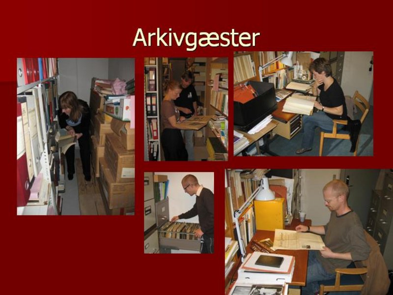 Brugerne af Universitetshistorisk Udvalgs samlinger udgør en bred kreds af universitetshistorisk interesserede enkeltpersoner/forfattere, organisationer og museer. På foto til venstre ses specialestuderende Maibritt Kerner i færd med at fremfinde materiale om datalogiens historie i Århus i professor Svend Bundgaards arkiv. Øverst i midten repræsentanter for Studenterrådets styrelse, som studerer materiale som led i planlægning af jubilæumspublikation; nederst i midten cand.mag. Jens Degn ved Victor Albecks arkiv, der kom til at spille en central rolle for hans jubilæumsbog om Klassisk Filologis første 75 år ved Aarhus Universitet; øverst til højre Trine Mørk Hansen, Kvindemuseet, fordybet i erindringsmateriale med henblik på ny udstilling i Kvindemuseet; og nederst til højre museumsinspektør Steen Lundbye, Bymuseet, optaget af overvejelser vedrørende lån af genstande til montre om Århus som uddannelsesby i Bymuseets nye permanente byhistoriske udstilling. (Fotos Universitetshistorisk Udvalg 2005 og 2006).