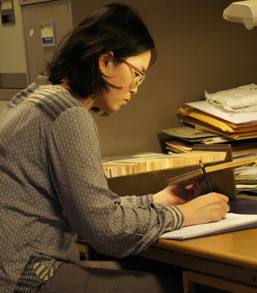 Katrine Hviid fra AUS fordyber sig under et studiebesøg hos AU Universitetshistorie i de historiske kilder mhp. et overblik over mulighederne og måske en 'løsning' på problemet.