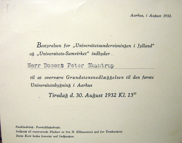Den 30. august 2017 er det 85 år siden, at grundstensnedlæggelsen til Aarhus Universitets første bygning fandt sted - nærmere bestemt skete det den 30. august 1932. Grundstensnedlæggelsen udgjorde første trin i opførelsen af en bygning, hvis arkitektur i dag beundres af arkitekturkyndige overalt i verden, og som har dannet den grundmodel for det modernistiske byggeri, som skulle blive opført på Aarhus-campussen i de efterfølgende mange årtier, og murskeen har vi i den universitetshistoriske samling!