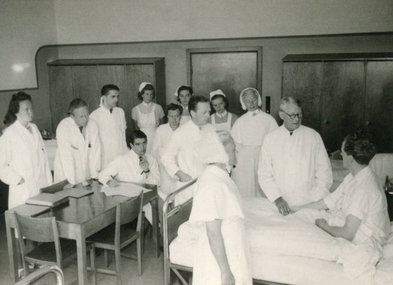 På billedet, der er gengivet i nærværende sides venstre spalte, er vi til stuegang på Amtssygehuset i slutningen af 1940'erne. Billedet gengives i bogen på side 96. Et billede fra samme lokale - eller et ganske tilsvarende - og oven i købet med en genganger blandt personalet vises på side 162 - se også gengivelsen af bogens forside nederst til højre (til venstre for disse linjer) - men her fortæller bogens billedtekst, at det viser en stuegang på Kommunehospitalet i 1950'erne!
