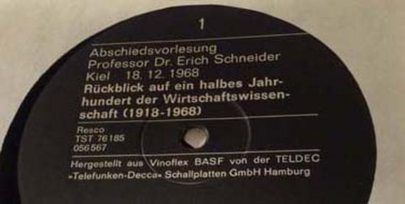 I en nyerhvervet samling af materiale med relation til professor, dr.oecon. Jørgen Pedersen (1890-1973) befinder sig noget så usædvanligt som en grammofonplade med en afskedsforelæsning. Stemmen på pladen tilhører Erich Schneider (1900-1970), Jørgen Pedersens AU-kollega 1936-1945, og afskedsforelæsningen holdt Schneider i 1968 i Kiel, hvor han havde været ansat, siden han i 1945 var blevet tvunget til at tage sin afsked fra AU (se presseomtale 1945).