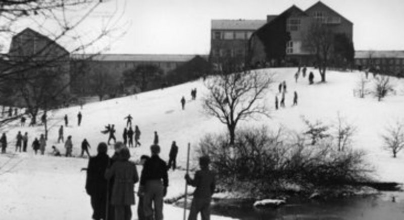Hvad nutidens vintre ofte - og vist gerne uden noget videre statistisk belæg - hævdes at mangle af sne, har vi til fulde på dette januarbillede fra Universitetsparken i året 1953, der - dette være nævnt en passant - var Aarhus Universitets 25-års jubilæumsår. For mange indfødte århusianere vil det være barndommens glade og lyse søndagsland, der stråler dem i møde fra dette indbydende snelandskab.