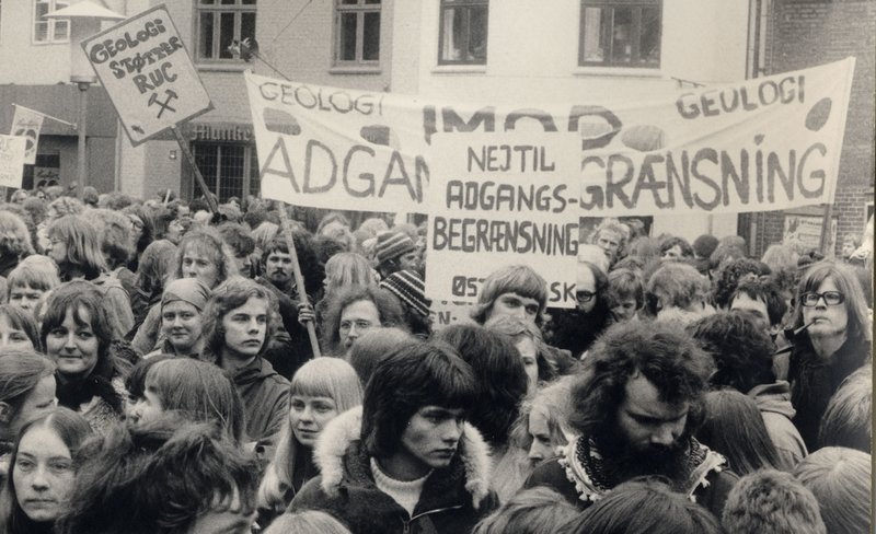 Indtil for 40 år siden kunne alle med adgangsgivende eksamen komme ind på universiteter og universitetscentre. Næsten da, for der var kort forinden blevet indført adgangsbegrænsning på medicin og psykologi. Billedet her viser demonstrerende geologistuderende, der ikke blot protesterer imod den annoncerede adgangsbegrænsning, men også ”støtter RUC”, dvs. daværende Roskilde Universitetscenter, der på det tidspunkt blev styret af et eksternt rektorat – den såkaldte ”junta”.