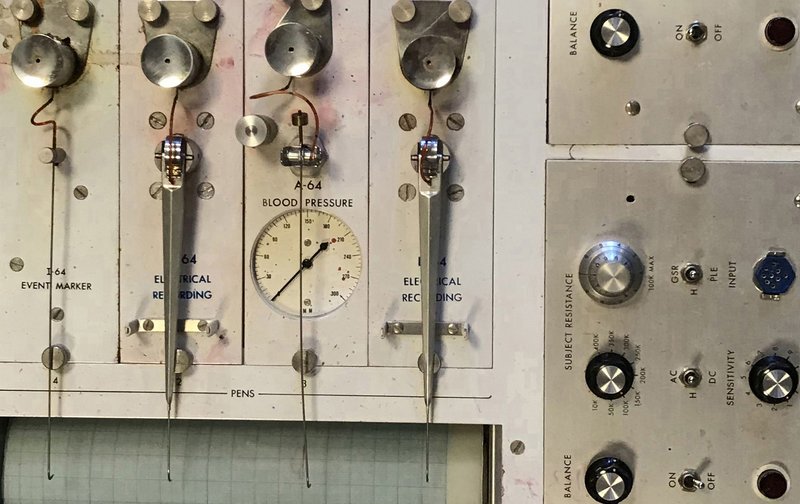 Apparatet, hvis instrumentbræt vi ser herover, er for ganske nylig dukket op i forbindelse med oprydning i loftslokaler et sted på Aarhus Universitet og er efterfølgende blevet overdraget til den universitetshistoriske samling. Adskilligt tyder på, at apparatet - der populært kaldes en løgnedetektor - stammer fra Psykologisk Institut, hvor der i forbindelse med forskning i 1970'erne har været anvendt forskellige former for psykofysiologiske metoder.