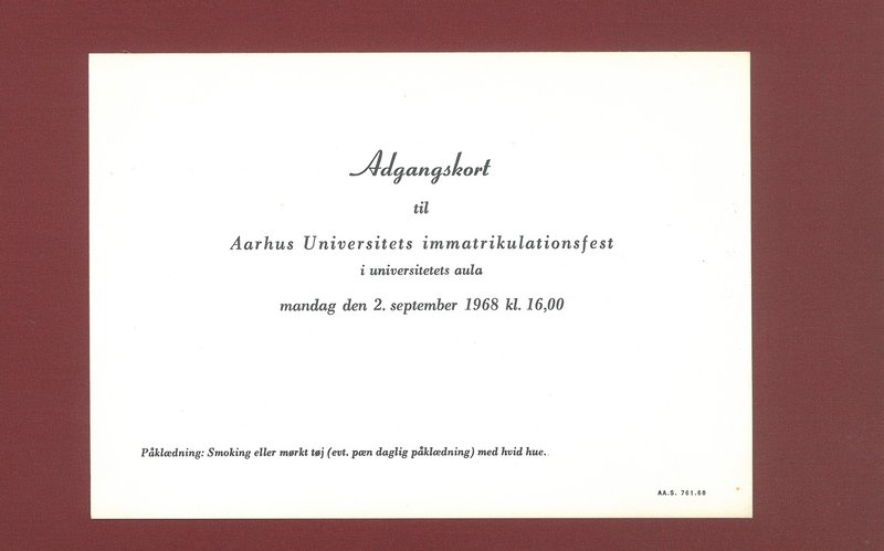 Måske har vi gået og troet, at det skyldtes de nyslåede studenters eget ønske, og at det var traditionen, og ikke et specificerende påklædningskrav fra universitetets side, der gjorde, at så godt som alle studenter op gennem 50'erne og 60'erne var iført hvid studenterhue ved de årlige immatrikulationsfester, men nu viser et nyerhvervet dokument, nemlig et adgangskort til immatrikulationsfesten i 1968, at den hvide hue - i hvert fald det år - var et 'ønske' fremsat af universitetet.