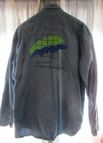 Skjorte i denimstof fremstillet i forbindelse med åbent hus-arrangement i DMU 27. september 1998 (som led i Dansk Naturvidenskabsfestival)