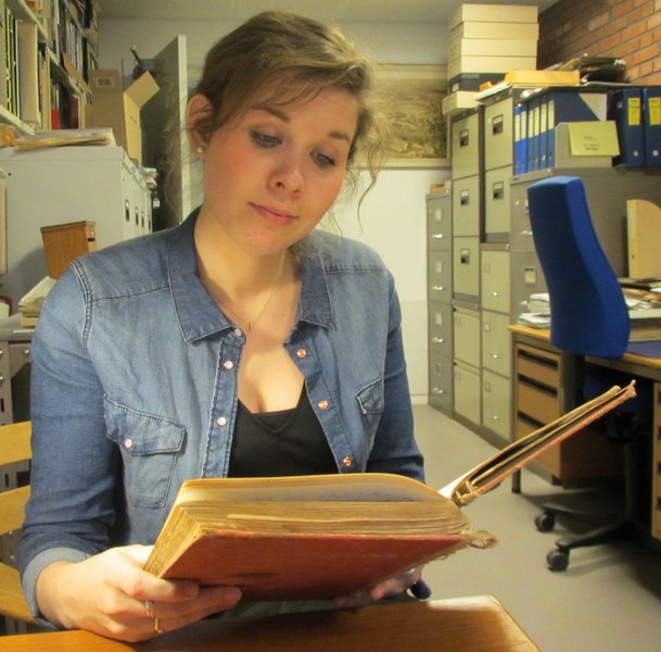 På billedet her studerer Caja Lola Schou Tofft bogen en sidste gang, inden hun overlader den i AU Universitetshistories varetægt.