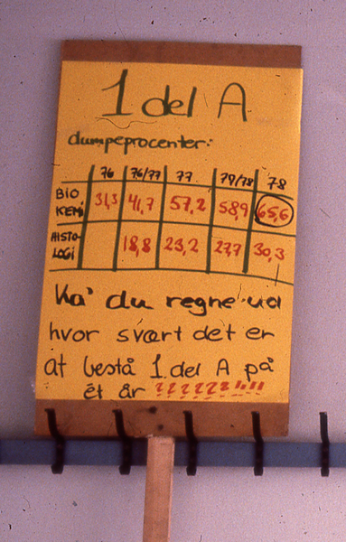 Aktivisternes begrundelse for besættelsen af instituttet var, at statistikken viste, at stadig færre bestod 1. del A på et år - faktisk kun 13 %, hed det på en plakat - mens "resten bruger 1½-2 år". Studenterne mente, at der var sket stramninger "som følge af en kraftig udvidelse af de naturvidenskabelige fag på medicin" - herunder altså især biokemi - og at denne stramning var sket "på bekostning af de samfundsmedicinske fag".
