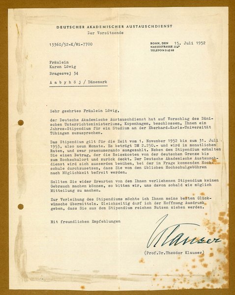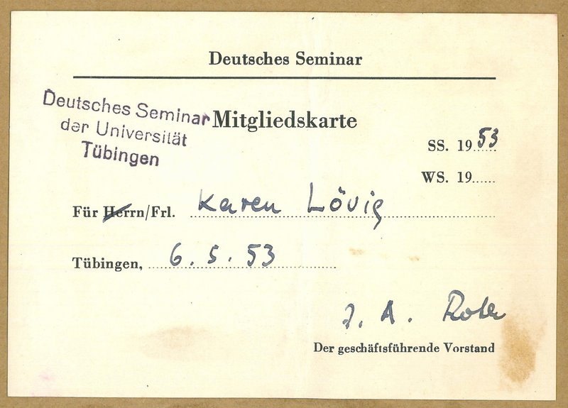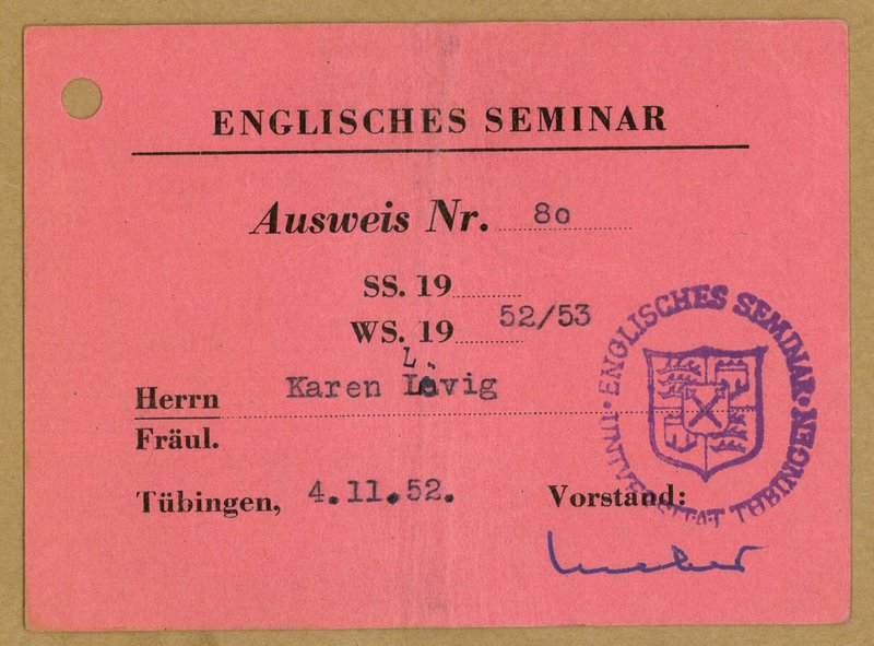 Fhv. lektor, cand.mag. Karen Løvig har til Universitetshistorisk Udvalg overdraget adskillige albumsider indeholdende hovedsagelig materiale fra studieophold i udlandet, men også materiale vedr. undervisning, kollegieliv, studenterteater, studentersvømning og kandidatfestligheder m.v.