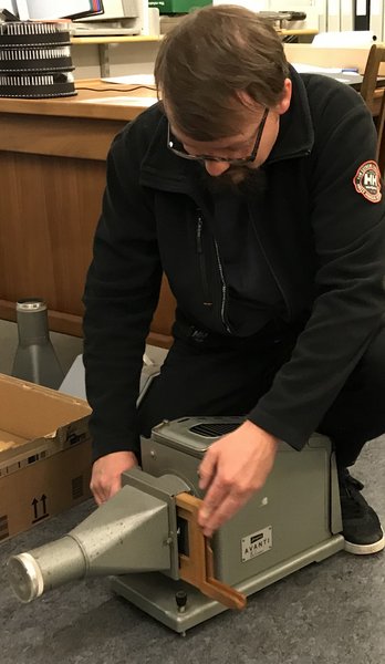 Blandt de genstande, som i marts blev overdraget af museumsbetjent, cand.mag. Anders Meander Bjerggaard, Antikmuseet, var et Liesegang-diaskop fra 1950'erne med diasrammer af træ i forskellige størrelser og et mikrofilmslæseapparat (Super Dagmar A fra J.H. Mullens NV, Den Haag).