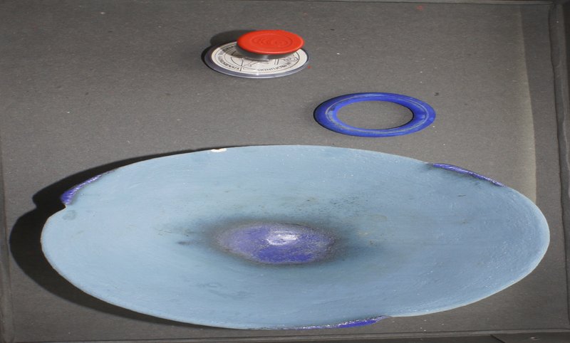 Et femte stempel tjente til påstempling af Aarhus Universitets segl i bunden af en skål, som universitetet på et tidspunkt anvendte som gave. Den spidsbundede skål placeredes i et cirkulært fundament, som i virkeligheden blot var en gardinring malet i en farve, der matchede skålens. Materialet tilhører Universitetshistorisk Udvalg. Klik og forstør.