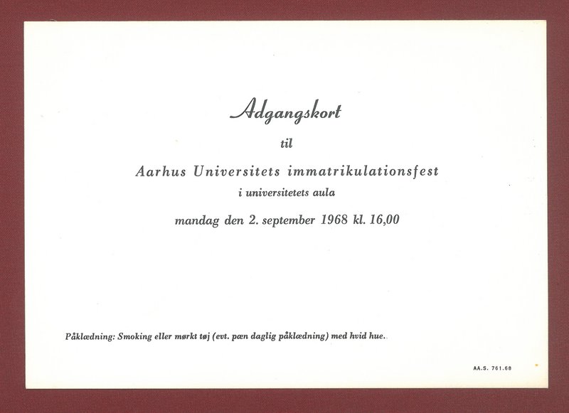 Måske har vi lidt naivt gået og troet, at det skyldtes de nyslåede studenters eget ønske, og at det var traditionen, og ikke et specificerende påklædningskrav fra universitetets side, der gjorde, at så godt som alle studenter op gennem 50'erne og 60'erne var iført hvid studenterhue ved de årlige immatrikulationsfester, men nu viser et nyerhvervet dokument, nemlig et adgangskort til immatrikulationefesten i 1968, at den hvide hue - i hvert fald det år - var et ønske fremsat fra universitetets side.