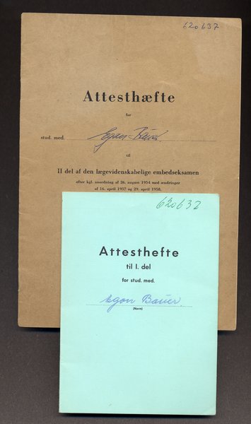 Attesthæfter fra det lægevidenskabelige studium 1960'erne. I hæfterne attesterede de kursusansvarlige, at hæftets ejer havde deltaget i undervisningen på tilfredsstillende vis. Dokumenterne tilhører Universitetshistorisk Udvalg. Klik og forstør.