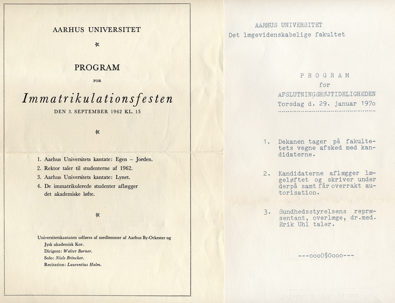 Fra stud.med.'ens aflæggelse af det akademiske løfte ved Immatrikulationsfesten i 1962 (punkt 4) til den lægevidenskabelige kandidats aflæggelse af lægeløftet ved Afslutningshøjtideligheden 1970 (punkt 2). Dokumenterne tilhører Universitetshistorisk Udvalg. Klik og forstør.