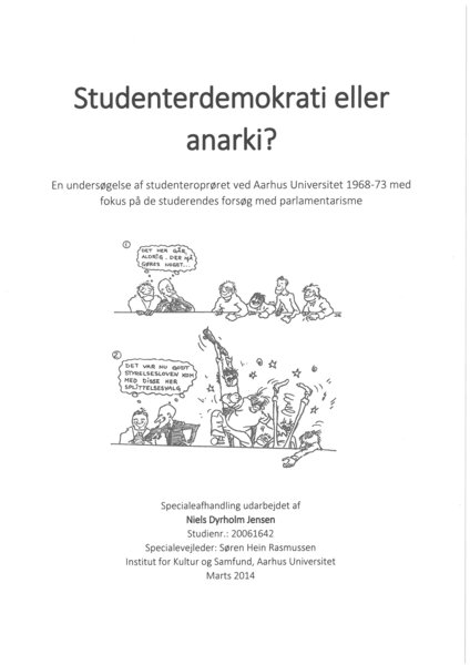 Sideløbende med volontørprojektet - men stort set uafhængigt heraf - har Niels Dyrholm Jensen i 2014 med anvendelse ikke mindst af arkivalier indsamlet af AU Universitetshistorie forfattet et universitetshistorisk speciale med titlen Studenterdemokrati eller anarki? En undersøgelse af studenteroprøret ved Aarhus Universitet 1968-73 med fokus på de studerendes forsøg med parlamentarisme.