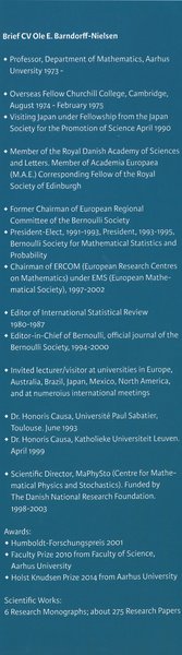 Hele tiden sidder man som læser med en fornemmelse af, at forfatteren ligesom forsøger at underspille, at han selv er en af de helt store i den internationale liga af tilfældighedsforskere, men hvad han ikke selv siger, kan man så aflæse af f.eks. plakaten på side 267, nemlig at en stor Aarhus-konference anno 2015 om sandsynlighedsteori og matematisk statistik og disses anvendelse afholdtes for at fejre Barndorff-Nielsens videnskabelige resultater.