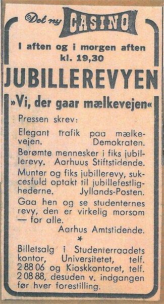 Jubillesangen indgik desuden i den revy, som Musiske Studenter satte op ved Jubillefesten i september 1953: "Vi, der gik mælkevejen".