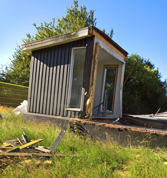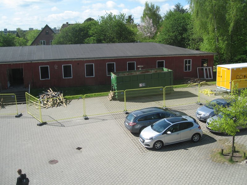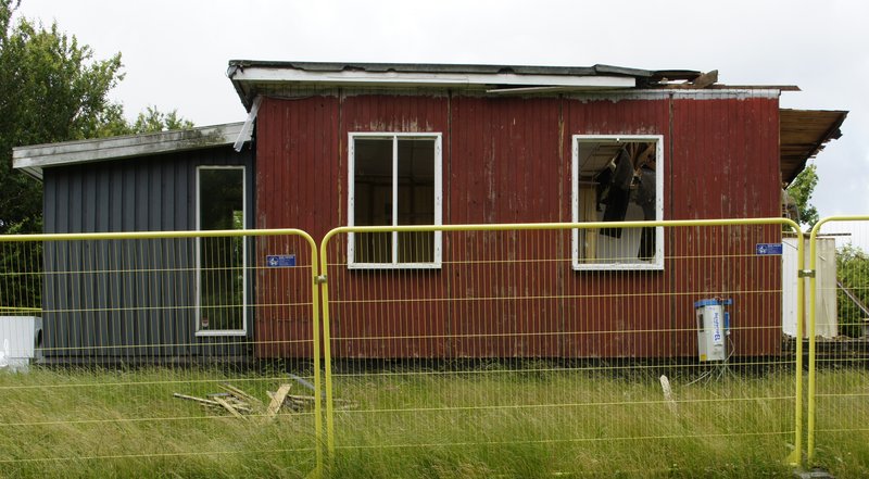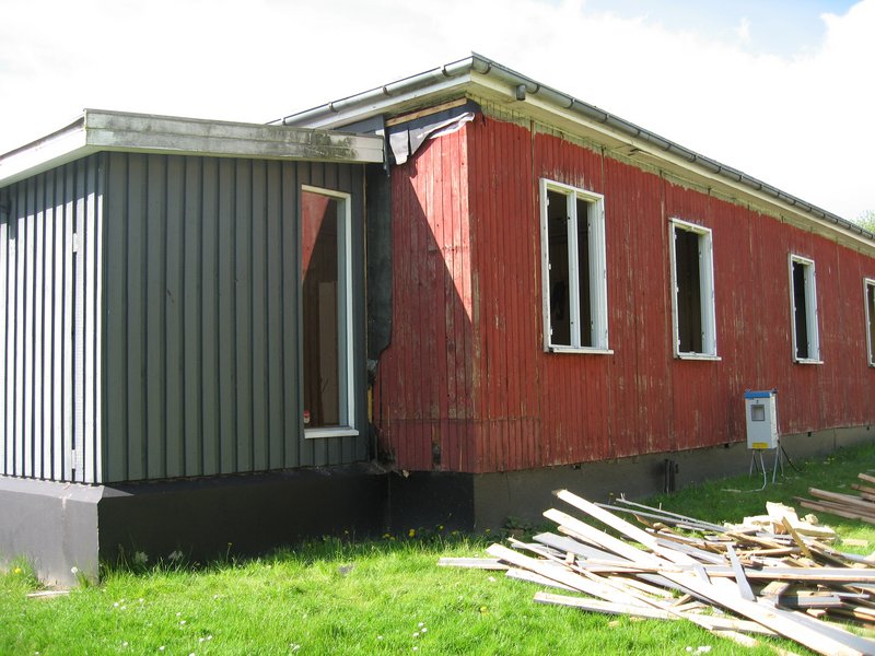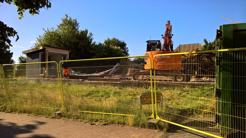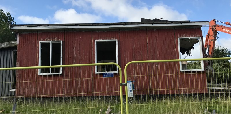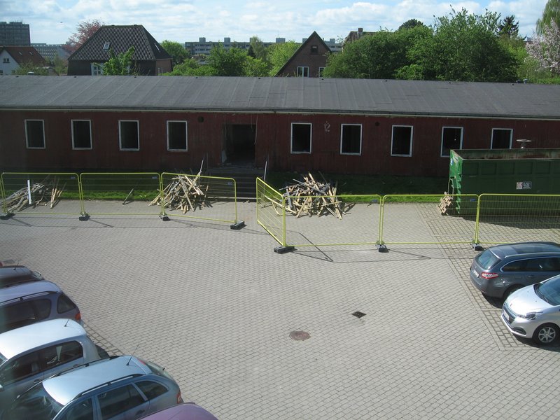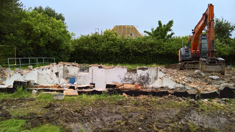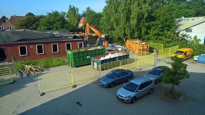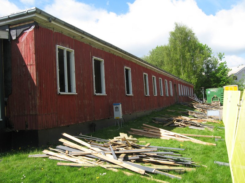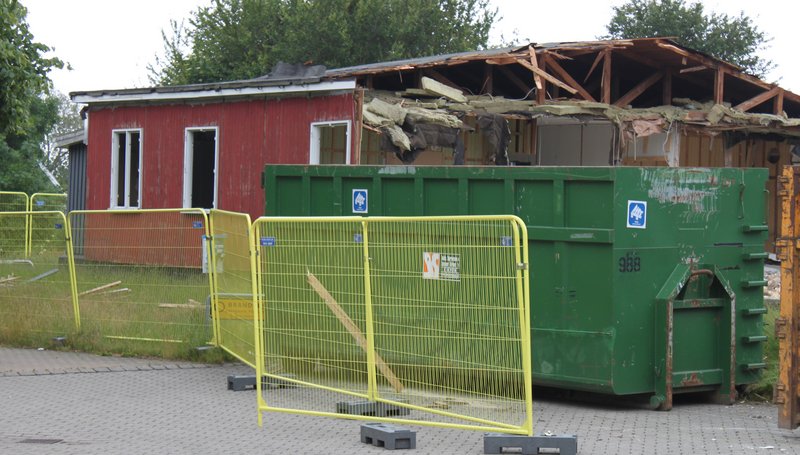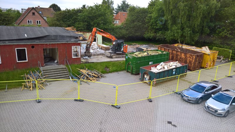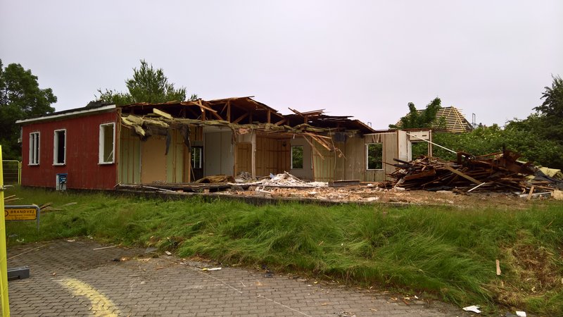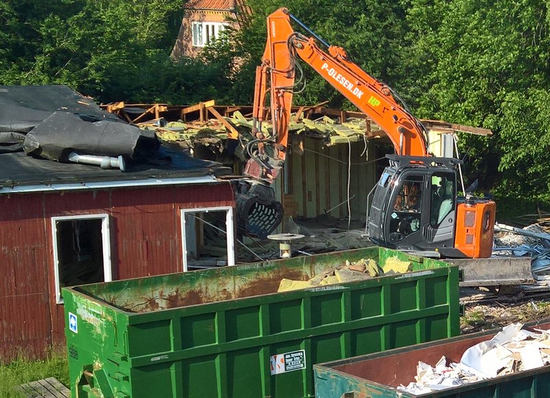 Det oplyses, at nedrivningen stod på ganske længe, idet det yderste koksgrå bræddelag først skulle pilles af manuelt, fordi det underliggende isolationsmateriale skulle udtages på en miljømæssigt forsvarlig måde. Også vinduerne blev udtaget manuelt.