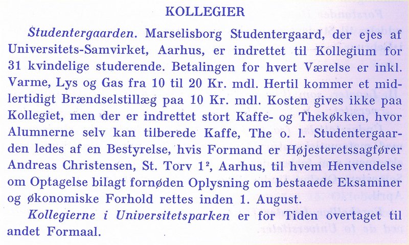 Frem til besættelsens ophør boede der udelukkende mandlige studerende i parkkollegierne. Et kvindekollegium fandtes dog, nemlig Marselisborg Studentergaard, som havde været mandskollegium fra 1928, men som i 1941 var blevet omdannet til kvindekollegium. Efter at Gestapos hovedkvarter var blevet tilintetgjort ved luftangrebet 31. oktober 1944, beslaglagde tyskerne Marselisborg Studentergaard, hvorpå der indrettedes midlertidigt kvindekollegium i en bygning på Vester Allé.