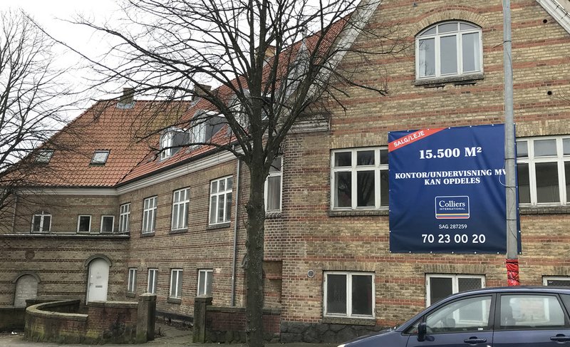 Billedet herover viser Trøjborgkompleksets hovedindgang og facaden langs Niels Juelsgade.