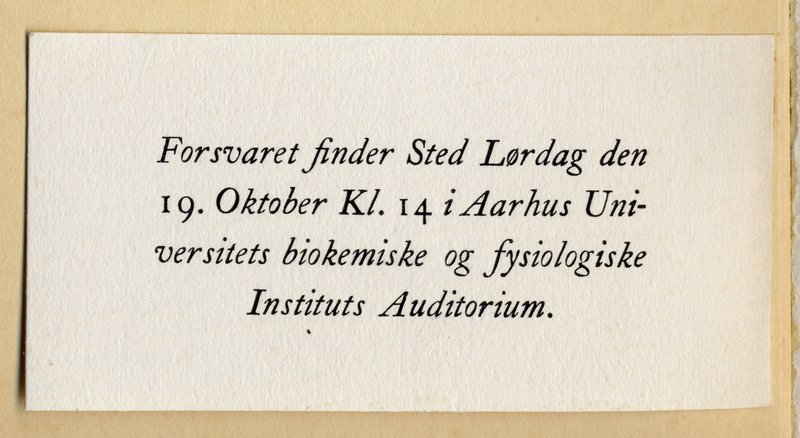 Mærkaten på det midterste billede herover er indsat i hvert eksemplar af disputatsen; det omtalte auditorium, hvor disputatsforsvaret fandt sted, kan man se (udefra) ved klik her. Teksten umiddelbart herover stammer fra Aarhus Universitets årsberetning. Som det fremgår, var de officielle opponenter professor, dr.phil. C.O. Bøggild-Andersen og docent dr.phil. Adam Afzelius.