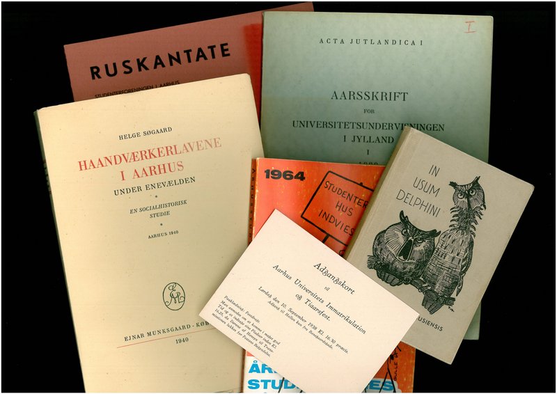 Det udlånte materiale omfatter fem træskilte stammende fra Aarhus Universitets første bygning fra 1933 samt tryksager: Årsberetning fra Universitetsundervisningen i Jylland 1929 (dvs. Aarhus Universitets første årsberetning), adgangskort til Aarhus Universitets 10-års jubilæum 1938 i Aarhus-Hallen, museumsdirektør Helge Søgaards disputats fra 1940 (den første doktordisputats forsvaret ved Aarhus Universitet), Studenterforeningens festkantate 1940 og studentersangbogen in usum delphini (udgivet af Studenterrådet ved Aarhus Universitet i 1948) samt Århusstudenternes Håndbog 1964.