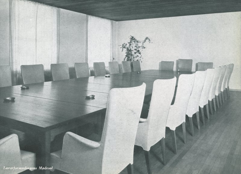 Her i Lærerforsamlingens mødesal ses en del af de "80 højryggede Armstole til Mødesal og Professorværelser", som var betrukket med svineskind, og som inklusive polstring kostede kr. 258, - pr. stk. jfr. arkitekt C.F. Møllers inventaroversigt af 28. marts 1944.