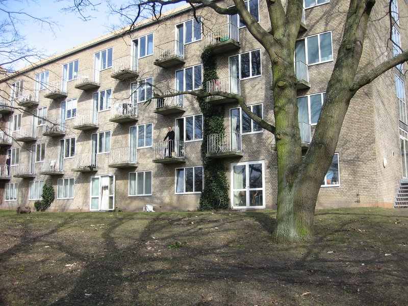 På altanen ved værelse 402 i Kollegium 9 ses beboeren anno 2010: Poul Erik Kryger Enevoldsen. Foto Universitetshistorisk Udvalg.